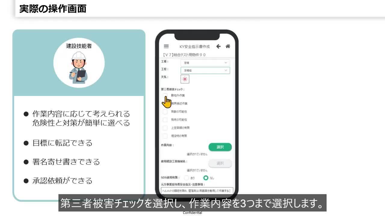 D-ST動画は災害予防のため弊社の安全遵守事項をもれなく伝達し、当日の施工内容にあった動画を手軽に視聴していただくことを目的としています。また、本動画は弊社現場の標準的なルールと安全教育を目的としており、現場毎の独自のルールや各法令に準拠し活用してください。