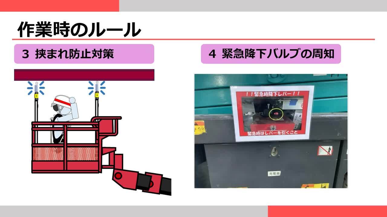 D-ST動画は災害予防のため弊社の安全遵守事項をもれなく伝達し、当日の施工内容にあった動画を手軽に視聴していただくことを目的としています。また、本動画は弊社現場の標準的なルールと安全教育を目的としており、現場毎の独自のルールや各法令に準拠し活用してください。